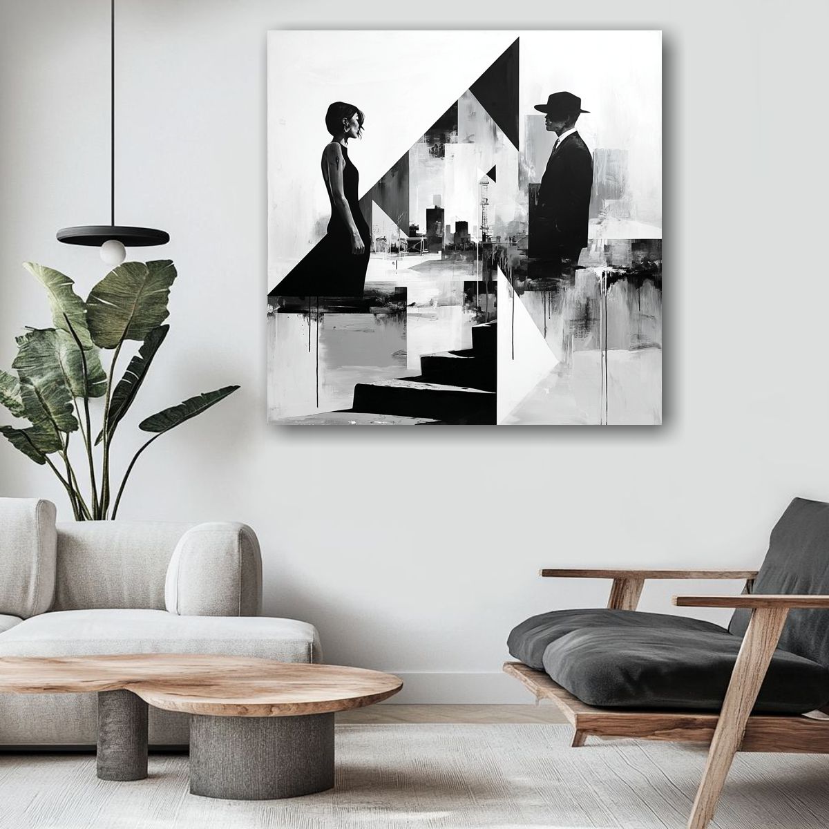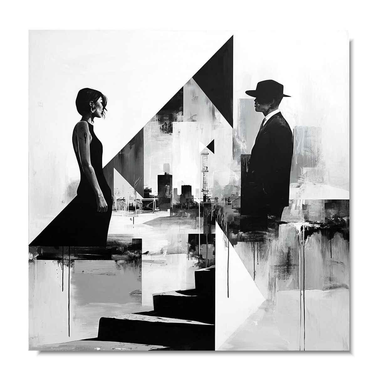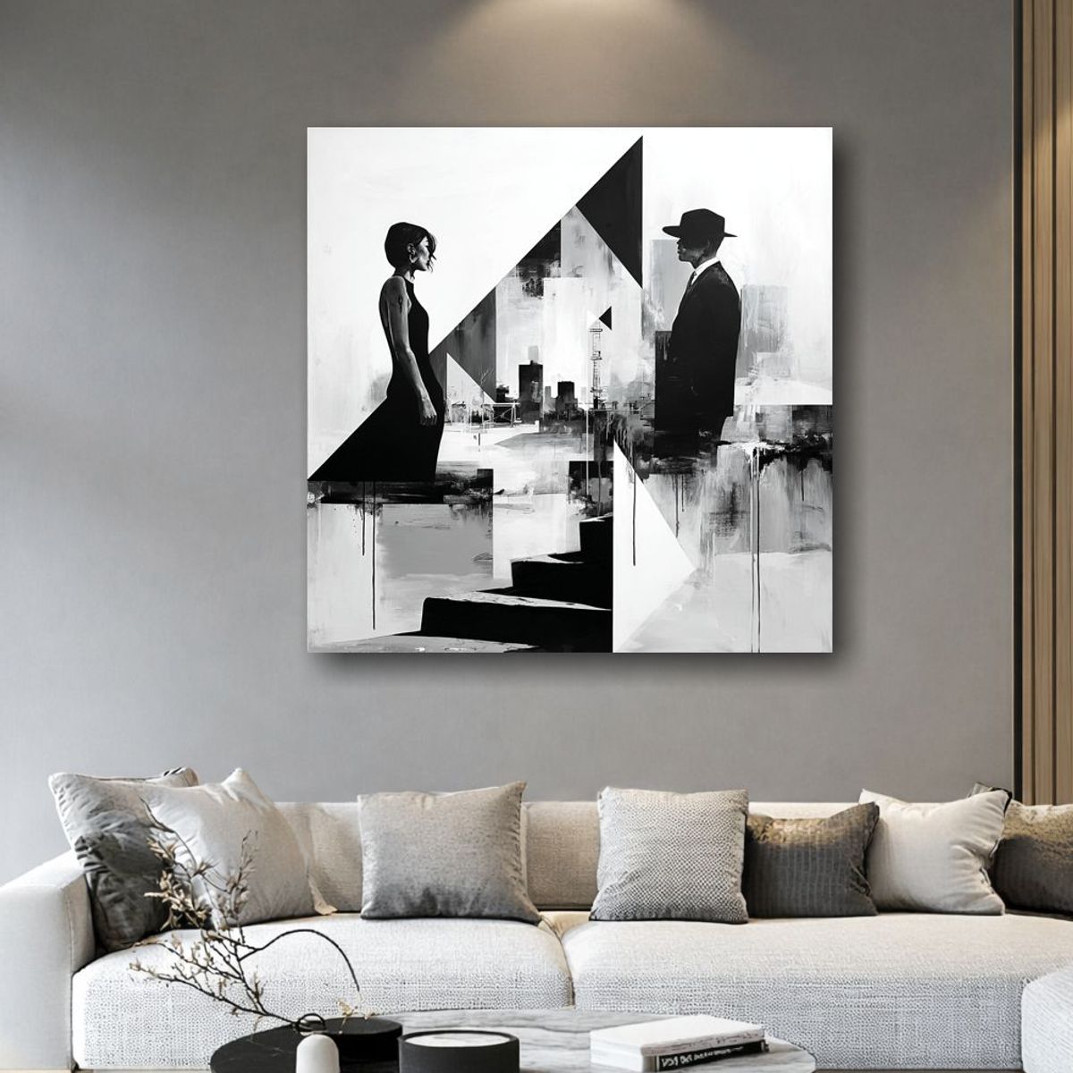 Motyw kobiety i mężczyzny ustawionych naprzeciw siebie buduje narrację i nadaje dziełu głębi interpretacyjnej. Wydruk na wysokiej jakości płótnie oddaje strukturę i malarski charakter obrazu, zachowując intensywność czerni i subtelność przejść tonalnych. Obraz abstrakcja doskonale sprawdzi się w nowoczesnym salonie, gabinecie, biurze lub wnętrzu w stylu loftowym.