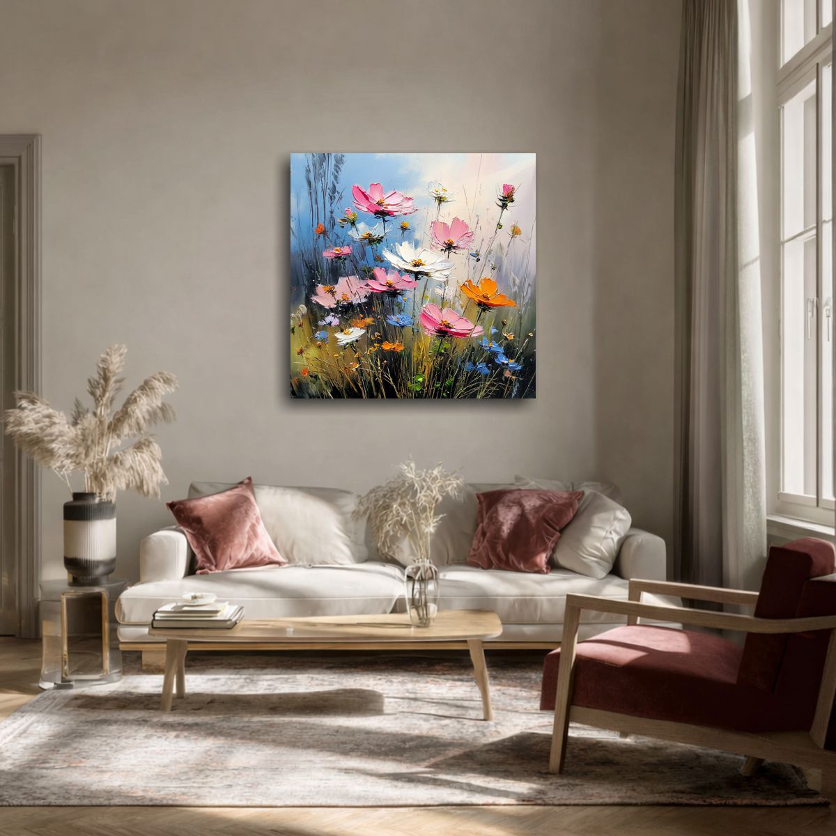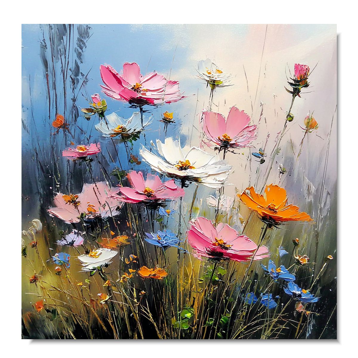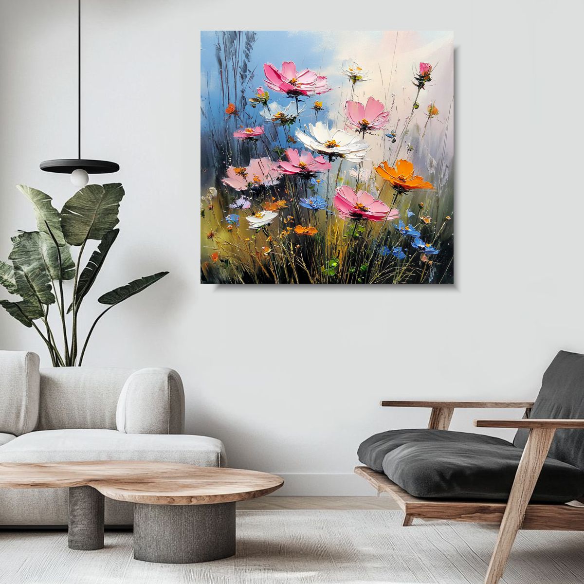Delikatny i pełen światła obraz abstrakcja przedstawiający kolorowe kwiaty to dekoracja ścienna, która wprowadza do wnętrza świeżość, lekkość i artystyczny klimat. Różowe, białe i pomarańczowe akcenty kwiatów kontrastują z subtelnym, pastelowym tłem, tworząc kompozycję pełną harmonii i ruchu.
